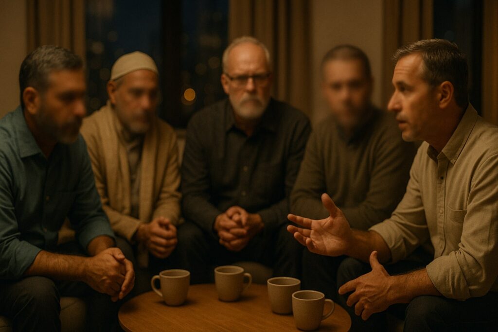 كان المساء يتهادى بلطفه على المدينة، حين اجتمعوا مجددًا بعد أعوامٍ طويلة. خمسة وجوهٍ اختزنتها ذاكرة العمل الإنساني، التقوا ذات